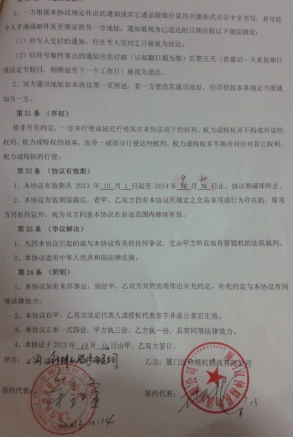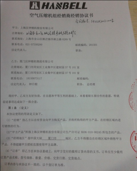 2013年10月份臺灣漢鐘精機授權(quán)廈門漢鐘精機有限公司--總代理經(jīng)銷權(quán)